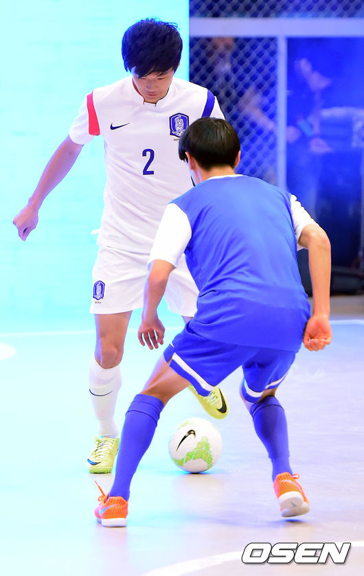 축구 국가대표 김진수가 원정 유니폼을 입고 축구 꿈나무들과 최첨단 디지털 축구경기장에서 이색 축구대결을 벌이고 있다.