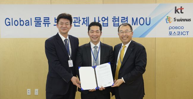 왼쪽부터 장원호 KT 글로벌 앤 엔터프라이즈(Global & Enterprise) M2M 사업담당, 신중조 에스위너스 대표, 최동익 포스코 ICT Smart SOC 최동익 본부장. /KT 제공.
