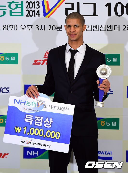 8일 오후 서울 여의도 63컨벤션센터 그랜드볼룸홀에서 진행된 'NH농협 2013-2014 V리그 시상식'에서 득점상을 차지한 삼성화재 레오가 포토타임을 갖고 있다.