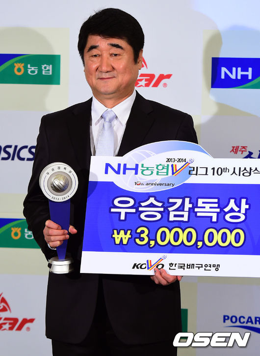 8일 오후 서울 여의도 63컨벤션센터 그랜드볼룸홀에서 진행된 'NH농협 2013-2014 V리그 시상식'에서 우수감독상을 수상한 신치용 감독이 포토타임을 갖고 있다.