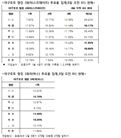 국민체육진흥공단(www.kspo.or.kr)이 발행하는 체육진흥투표권 수탁사업자인 스포츠토토 공식발매사이트인 베트맨(www.betman.co.kr)은 9일(수)에 열리는 두산-SK, 넥센-KIA, 롯데-LG, NC-한화 등 4경기 8개팀을 대상으로 한 야구토토 랭킹 3회차 스트레이트 게임 중간집계결과 넥센(48.17%) NC(46.69%), SK(41.85%)를 차례로 다득점 상위 3개팀으로 꼽았다고 밝혔다. 반면 KIA와 한화는 각각 29.20%와 31.04%를 득표해 가장 적은 득점을 기록할 것으로 예상했다.