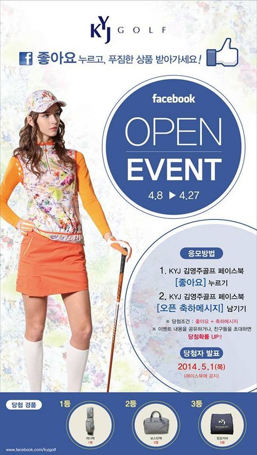 KYJ골프는 8일부터 오는 27일까지 KYJ골프 페이스북을 방문해 ‘좋아요’를 누르고, 오픈축하메시지를 남기는 고객을 추첨해 캐디백, 보스턴백, 항공커버 등 푸짐한 경품을 증정한다.