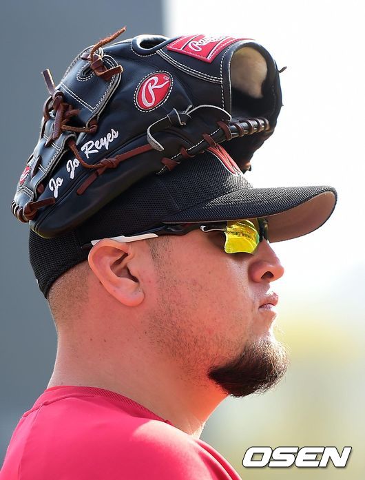 8일 오후 서울 잠실야구장에서 열리는 '2014 한국야쿠르트 세븐 프로야구' 두산 베어스와 SK 와이번스의 경기에 앞서 SK 레이예스가 훈련을 위해 그라운드로 나서고 있다.