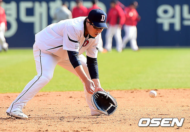8일 오후 서울 잠실야구장에서 열리는 '2014 한국야쿠르트 세븐 프로야구' 두산 베어스와 SK 와이번스의 경기에 앞서 두산 양의지가 내야 수비훈련을 하고 있다.