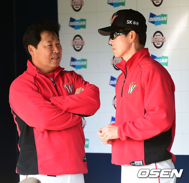 8일 오후 서울 잠실야구장에서 열리는 '2014 한국야쿠르트 세븐 프로야구' 두산 베어스와 SK 와이번스의 경기에 앞서 SK 이만수 감독과 성준 코치가 이야기를 나누고 있다.