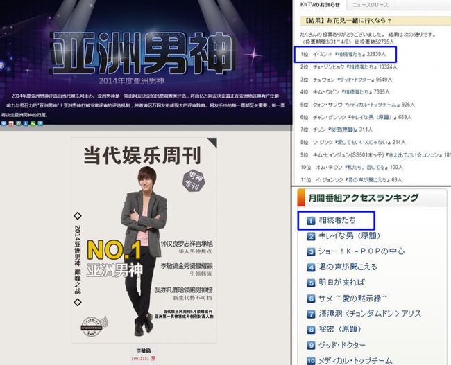 뿐만 아니라 얼마 전 중국의 음악 연예전문 사이트 쿠고우닷컴에서 진행한 ‘2014 한국 드라마 남신 투표’ 에서도 ‘상속자들’의 김탄 캐릭터로 한국을 대표하는 남신 1위에 올랐다. 이 투표에는 모두 1,355,150명이 참여했는데 이민호는 전체의 37%에 달하는 표를 얻으며 정상에 올랐다.