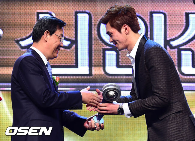 8일 오후 서울 여의도 63컨벤션센터 그랜드볼룸홀에서 진행된 'NH농협 2013-2014 V리그 시상식'에서 농협 김태영부회장으로 부터 수원한국전력 전광인이 신인선수상 트로피를 건네받고 있다.