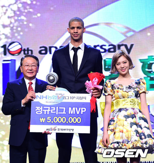 8일 오후 서울 여의도 63컨벤션센터 그랜드볼룸홀에서 진행된 'NH농협 2013-2014 V리그 시상식'에서 정규리그MVP를 수상한 대전 삼성화재 레오가 KOVO구자준 총재와 리지와 함께 포토타임을 갖고 있다.