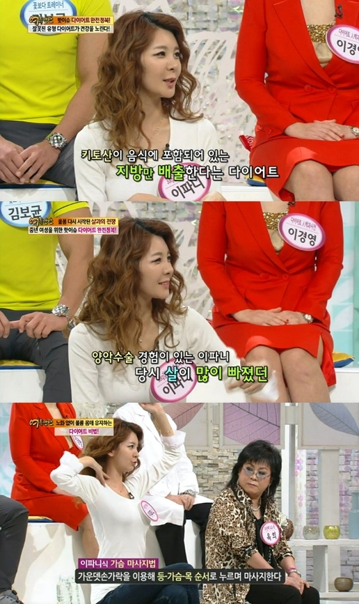 이날 이파니는 완벽한 몸매 유지를 위한 자신만의 마사지법을 공개해 눈길을 끌었다. 그는 "여자는 출산 후 모유 수유를 하면 살이 축 처진다"며 가슴과 엉덩이 마사지법을 소개했다.