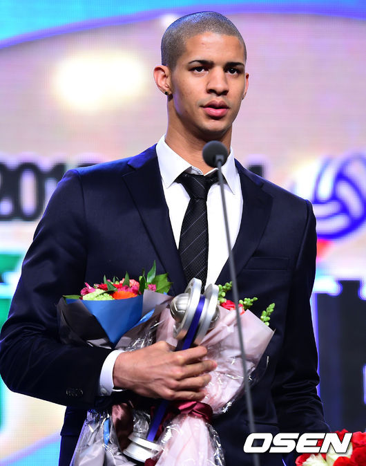 8일 오후 서울 여의도 63컨벤션센터 그랜드볼룸홀에서 진행된 'NH농협 2013-2014 V리그 시상식'에서 정규리그MVP를 수상한 대전 삼성화재 레오가 수상소감을 말하고 있다.