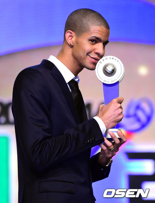 8일 오후 서울 여의도 63컨벤션센터 그랜드볼룸홀에서 진행된 'NH농협 2013-2014 V리그 시상식'에서 정규리그MVP를 수상한 대전 삼성화재 레오가 트로피 키스를 하고 있다.