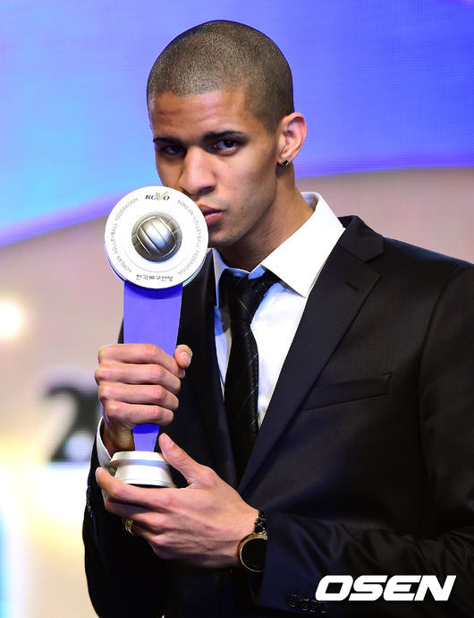 8일 오후 서울 여의도 63컨벤션센터 그랜드볼룸홀에서 진행된 'NH농협 2013-2014 V리그 시상식'에서 정규리그MVP를 수상한 대전 삼성화재 레오가 트로피 키스를 하고 있다.