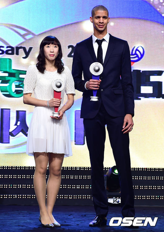 8일 오후 서울 여의도 63컨벤션센터 그랜드볼룸홀에서 진행된 'NH농협 2013-2014 V리그 시상식'에서 정규리그MVP를 수상한 정규리그MVP를 수상한 IBK이효희와 대전 삼성화재 레오가 포토타임을 갖고 있다.