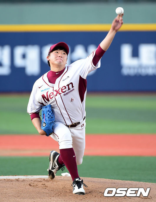 1회초 무사에서 넥센 선발투수 오재영이 힘차게 공을 던지고 있다.