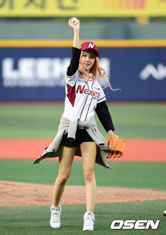 경기에 앞서 걸그룹 크레용팝 엘린이 시구를 하고 있다.