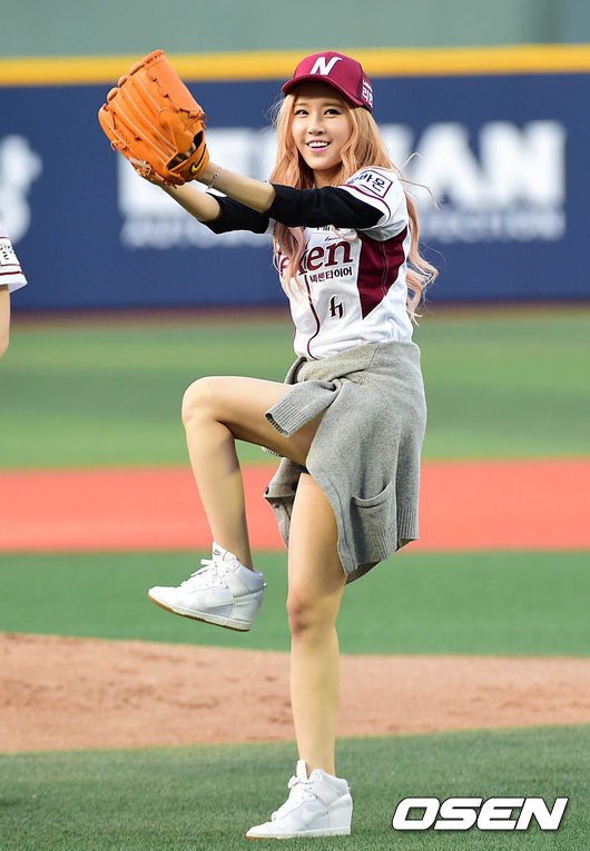 경기에 앞서 걸그룹 크레용팝 엘린이 시구를 하고 있다.