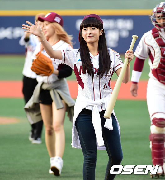 경기에 앞서 걸그룹 크레용팝 소율이 시타를 마치고 관중석을 향해 인사를 하고 있다.