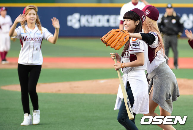 경기에 앞서 걸그룹 크레용팝 엘린과 소율이 시구와 시타를 마치고 관중석을 향해 손을 흔들고 있다.