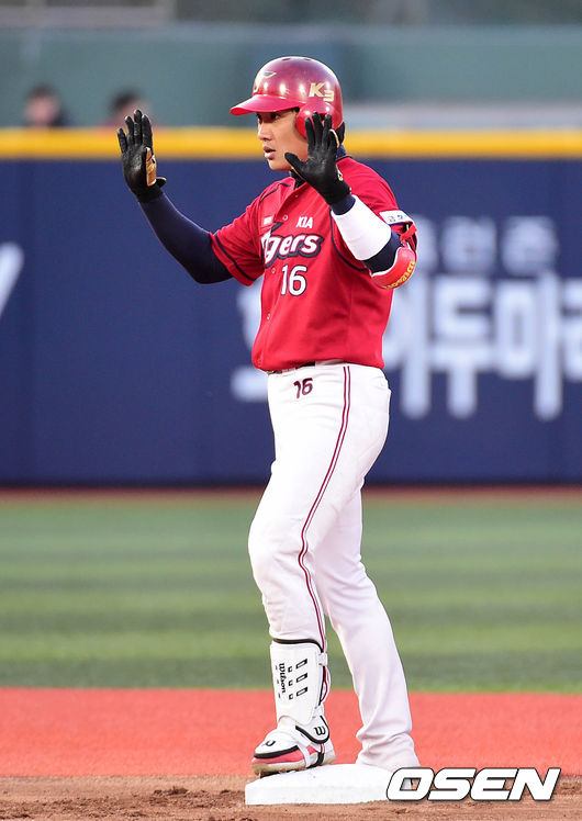 1회초 1사에서 KIA 김주찬이 우중간을 가르는 안타를 날리고 타임을 외치고 있다.