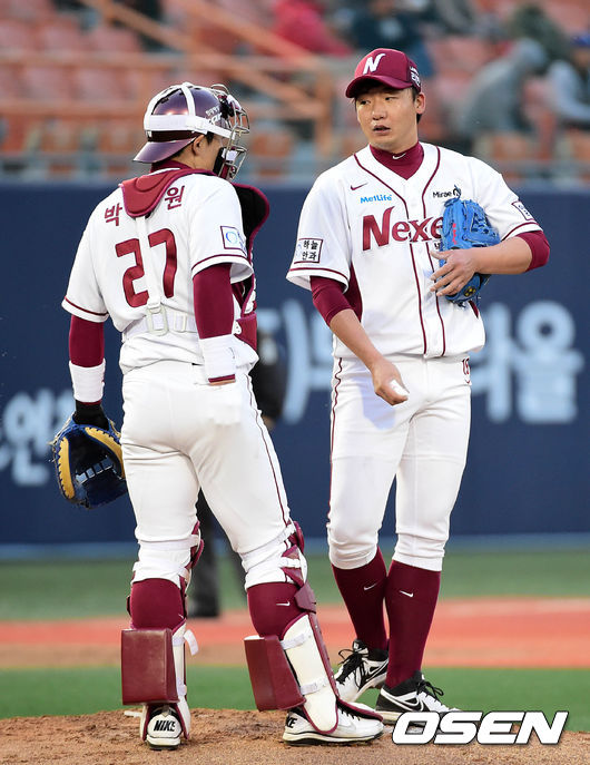1회초 2사 만루에서 넥센 오재영이 마운드를 방문한 포수 박동원과 이야기를 나누고 있다.