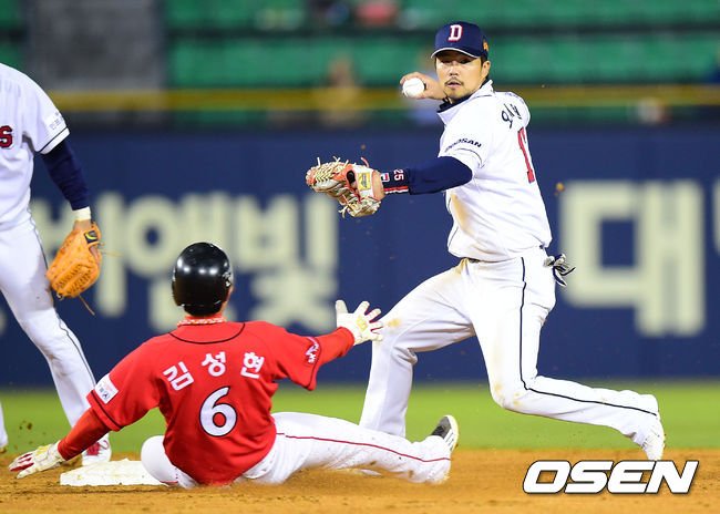 8일 오후 서울 잠실야구장에서 열린 '2014 한국야쿠르트 세븐 프로야구' 두산 베어스와 SK 와이번스의 경기, 5회초 1사 1루 두산 오재원이 SK 김강민의 내야 땅볼을 병살로 연결시키고 있다.