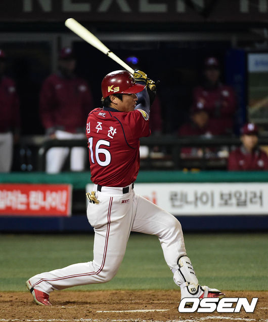 4회초 무사 1,3루에서 KIA 김주찬이 좌전 적시타를 치고 있다.