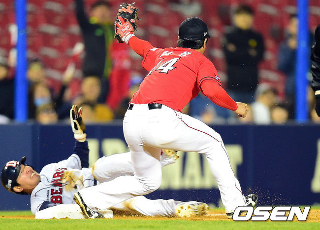 8일 오후 서울 잠실야구장에서 열린 '2014 한국야쿠르트 세븐 프로야구' 두산 베어스와 SK 와이번스의 경기, 5회말 2사 1,2루 두산 김재호가 3루 도루를 시도하다 SK 최정에게 아웃당하고 있다.