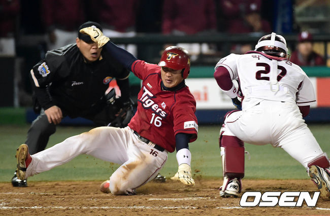 4회초 1사 2루 KIA 나지완의 좌전 적시타때 2루주자 김주찬이 홈에서 세이프되고 있다.