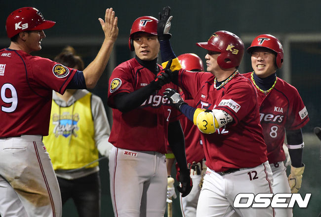 4회초 1사 만루에서 KIA 차일목이 좌월 만루 홈런을 치고 더그아웃에서 동료들과 환호하고 있다.
