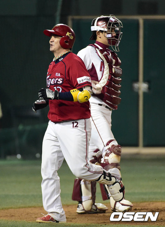 4회초 1사 만루에서 KIA 차일목이 좌월 만루 홈런을 치고 미소를 지으며 홈을 밟고 있다.