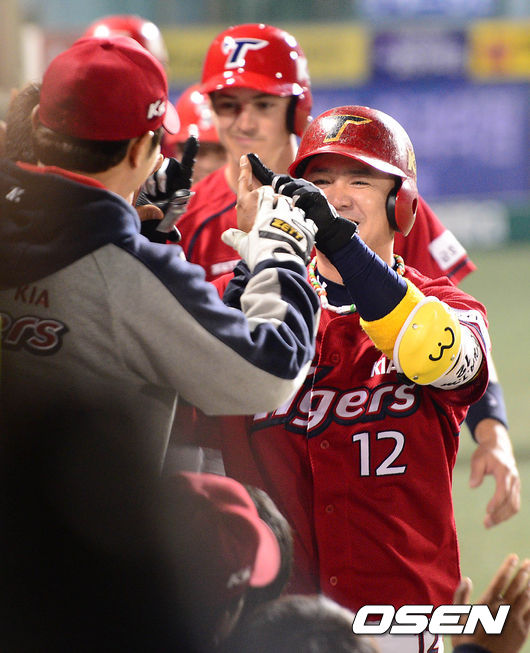 4회초 1사 만루에서 KIA 차일목이 좌월 만루 홈런을 치고 더그아웃에서 동료들과 환호하고 있다.