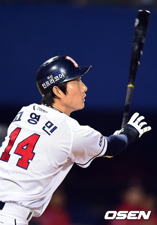 8일 오후 서울 잠실야구장에서 열린 '2014 한국야쿠르트 세븐 프로야구' 두산 베어스와 SK 와이번스의 경기, 8회말 1사 3루 두산 고영민이 중견수 희생플라이를 때리고 있다.