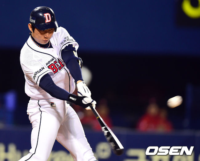 8일 오후 서울 잠실야구장에서 열린 '2014 한국야쿠르트 세븐 프로야구' 두산 베어스와 SK 와이번스의 경기, 8회말 1사 3루 두산 고영민이 중견수 희생플라이를 때리고 있다.