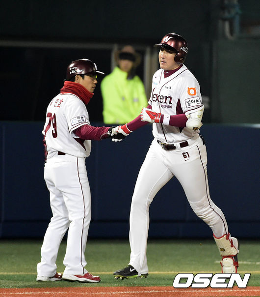 6회말 1사에서 넥센 유한준이 좌월 솔로홈런을 치고 3루에서 최만호 코치와 하이파이브를 하고 있다.