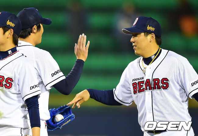 승리를 거둔 두산 이용찬과 김현수가기뻐하고 있다./youngrae@osen.co.kr