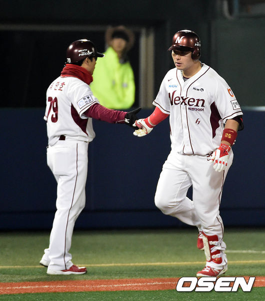 7회말 1사에서 넥센 박병호가 좌월 솔로 홈런을 치고 3루에서 최만호 코치와 하이파이브를 하고 있다.