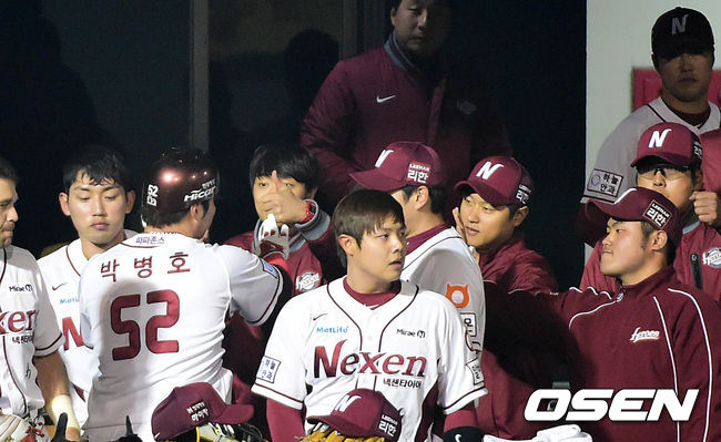 7회말 1사에서 넥센 박병호가 좌월 솔로 홈런을 치고 더그아웃에서 동료들의 축하를 받고 있다.