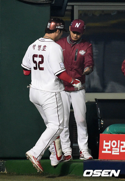 7회말 1사에서 넥센 박병호가 좌월 솔로 홈런을 치고 더그아웃에서 염경엽 감독과 하이파이브를 하고 있다.