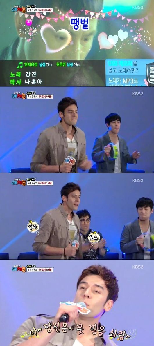 이날 줄리엔강은 목청 운동회 '우리동네 노래왕' 코너를 통해 '땡벌'을 열창했다. 그는 음정 박자를 무시한 채 온 몸을 덩실덩실 흔들며 무대를 꾸며 보는 이들을 폭소케 했다.