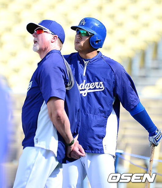 경기에 앞서 다저스 류현진이 배팅훈련을 하며 맥과이어 코치와 이야기를 나누고 있다.