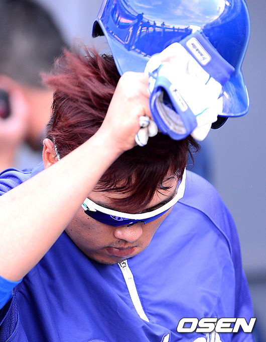 경기에 앞서 다저스 류현진이 타격 훈련을 마치고 더그아웃에서 헬맷을 벗고 있다.
