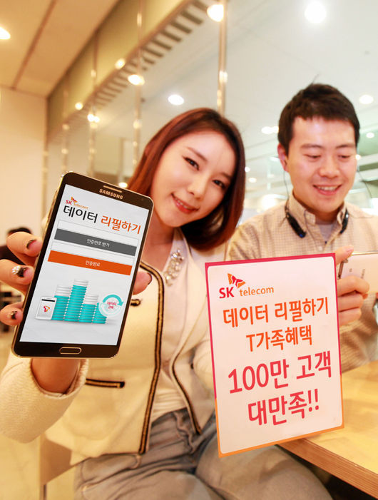 SK텔레콤은 장기, 가족고객 대상으로 한 '데이터 리필하기' 서비스의 월 이용건수가 100만 건을 돌파했다고 9일 밝혔다. 이는 출시 10개월 만에 약 3배가 증가한 것으로, 누적 이용건수는 800만 건이다.