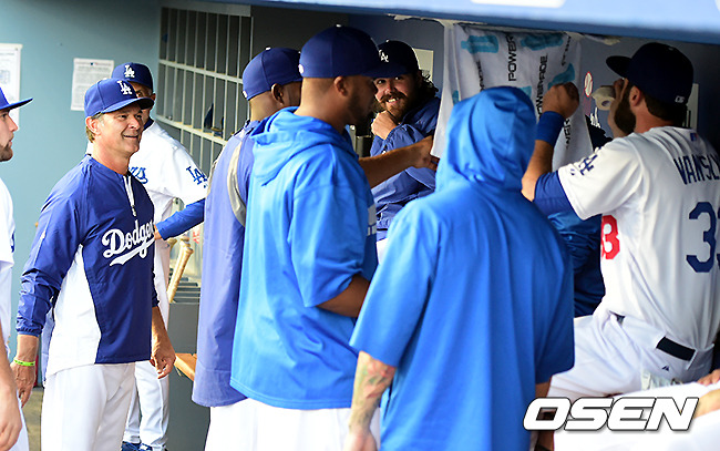 경기에 앞서 다저스 매팅리 감독이 얀센과 슬라이크가 더그아웃에 앉아 있는 류현진을 수건으로 가리는 모습을 보며 미소짓고 있다.