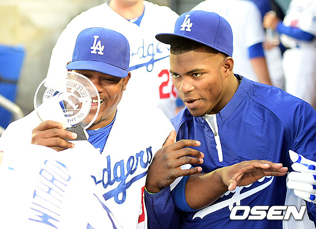 경기에 앞서 다저스 유리베가 수비상 트로피를 받고 기뻐하자 푸이그가 부러운 눈빛으로 바라보고 있다.