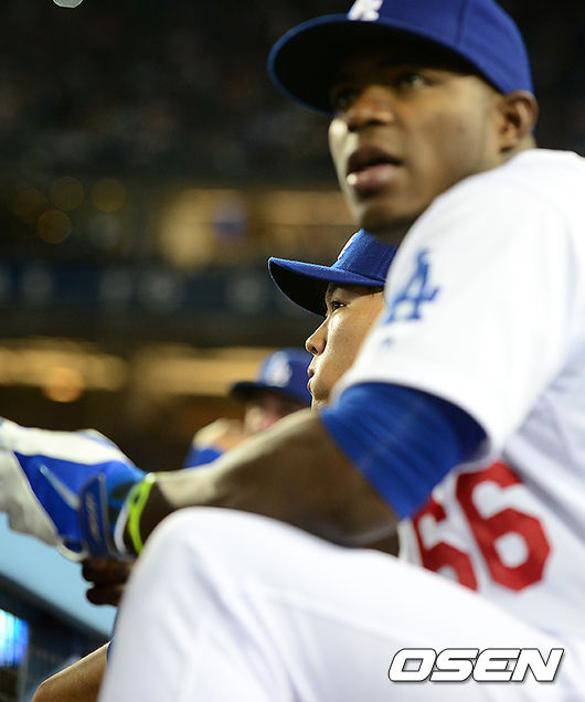 다저스 류현진이 푸이그와 더그아웃에서 경기를 지켜보고 있다.