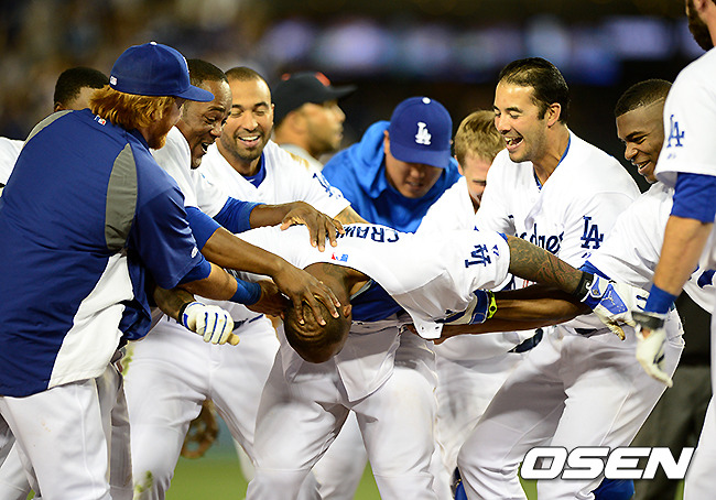 경기후 다저스 선수들이 크로포드와 승리를 기뻐하고 있다./ jpnews@osen.co.kr