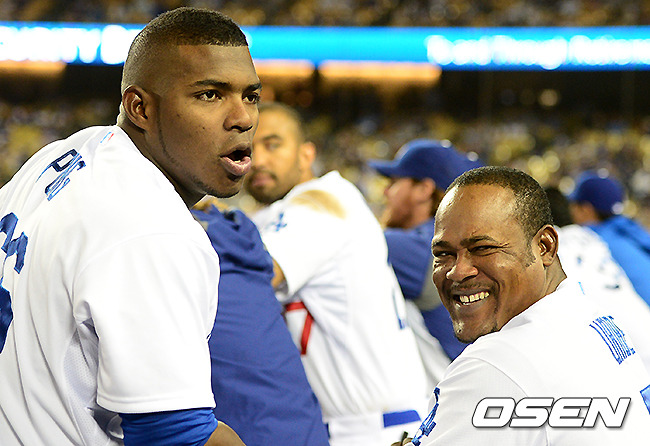 9회말 다저스 푸이그, 유리베가 더그아웃에서 이야기를 나누고 있다./ jpnews@osen.co.kr