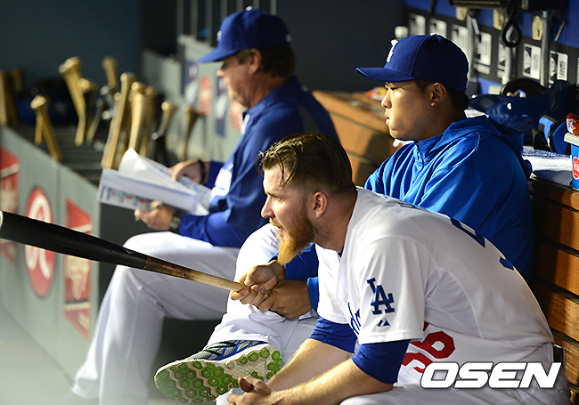 9회초 다저스 류현진이 더그아웃에서 배트를 만지고 있다./ jpnews@osen.co.kr