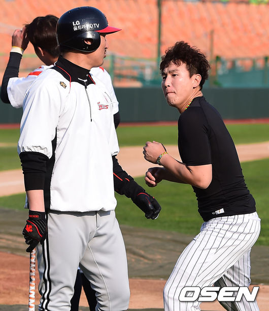 9일 오후 부산 사직구장에서 열린 '2014 한국야쿠르트 세븐 프로야구' 롯데 자이언츠와 LG 트윈스의 경기에 앞서 LG 이진영과 롯데 박준서가 장난을 치고 있다