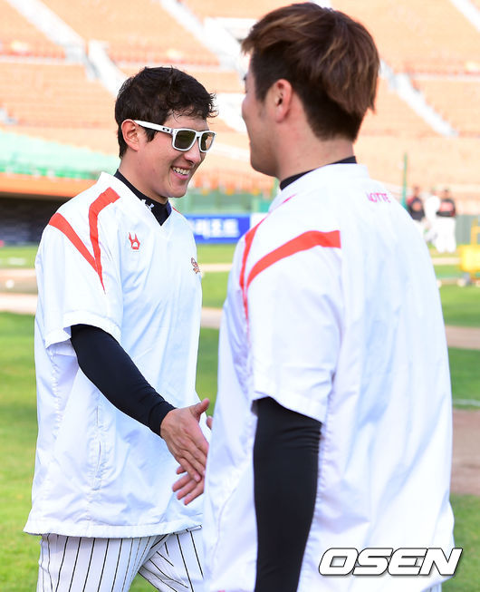 9일 오후 부산 사직구장에서 열린 '2014 한국야쿠르트 세븐 프로야구' 롯데 자이언츠와 LG 트윈스의 경기에 앞서 롯데 황재균과 강민호가 하이파이브를 하고 있다.